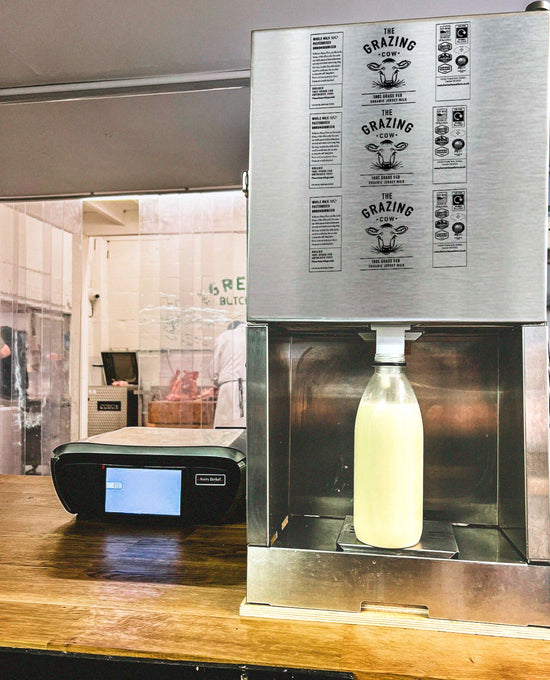 Organic 100% Pasture Fed Jersey whole milk, available in refillable glass bottles